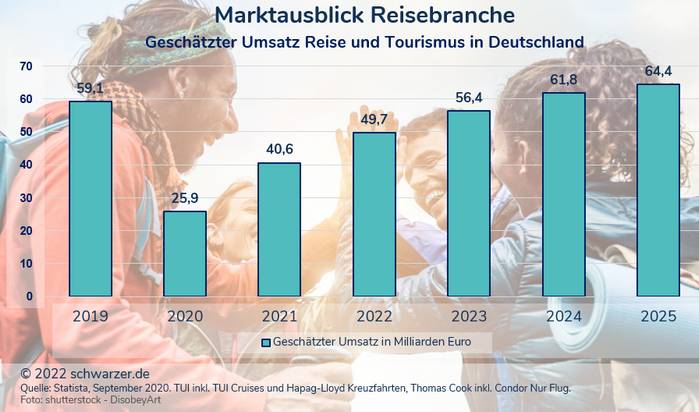 Infografik: Marktausblick für die Reise- und Tourismusbranche in Deutschland. Trotz Pleiten wie von GTI Reisen entwickelt sich die Branche gut. Die Umsätze werden dennoch erst 2024 wieder das Vorkrisenniveau erreichen. (Foto: shutterstock – DisobeyArt)